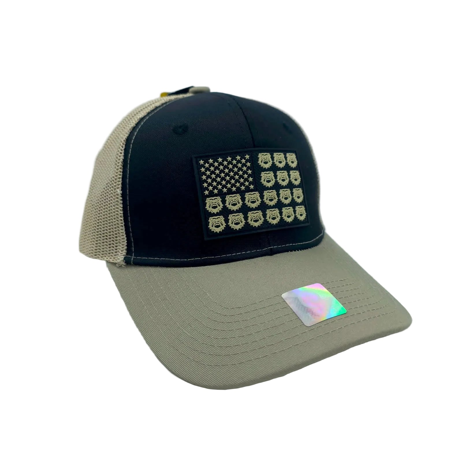 • Embroidered USA flag with bulldog faces forming the stripes