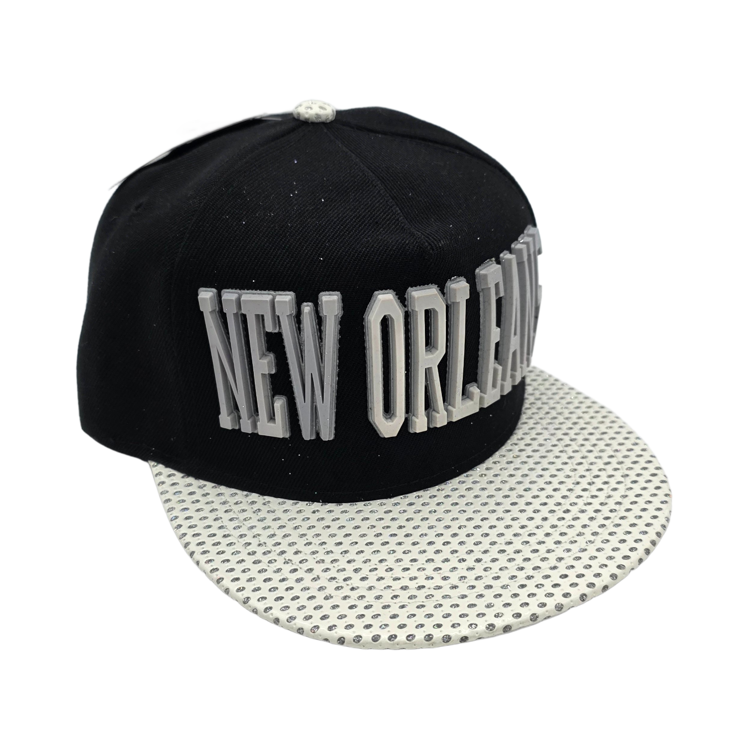 A bold New Orleans-themed essential designed for everyday style and comfort. The New Orleans 115 Snapback Cap features 100% polyester fabric with a structured design and a PU (polyurethane) leather-like mesh brim with a diamond-glittered underlay for a premium, eye-catching look. The front showcases a rubberized city name, while the back of the cap also includes the city name embroidered for a clean, finished detail.